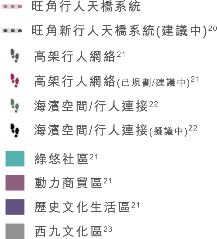 21. 「高架行人網絡」、「綠悠社區」、「動力商貿區」、及「歷史文化生活區」節錄自市區重建局<油麻地及旺角地區研究資料手冊>的建議及提出之發展概念。相關計劃可能不時出現改變,計劃興建之設施於發展項目入伙時亦可能尚未完成,並因應各種因素不時變更而可能不再適用。資料來源(擷取日期:2025年12月9日):市區重建局網站(油麻地及旺角地區研究資料手冊) - https://www.ura.org.hk/f/page/44/13214/Information%20Booklet.pdf。發展項目的周邊環境、建築物及設施可能不時改變,賣方對發展項目的周邊環境、建築物及設施並不作出任何不論明示或隱含之要約、陳述、承諾或保證。賣方建議準買家到有關發展地盤作實地考察,以對該發展地盤、 其周邊地區環境及附近的公共設施有較佳了解。