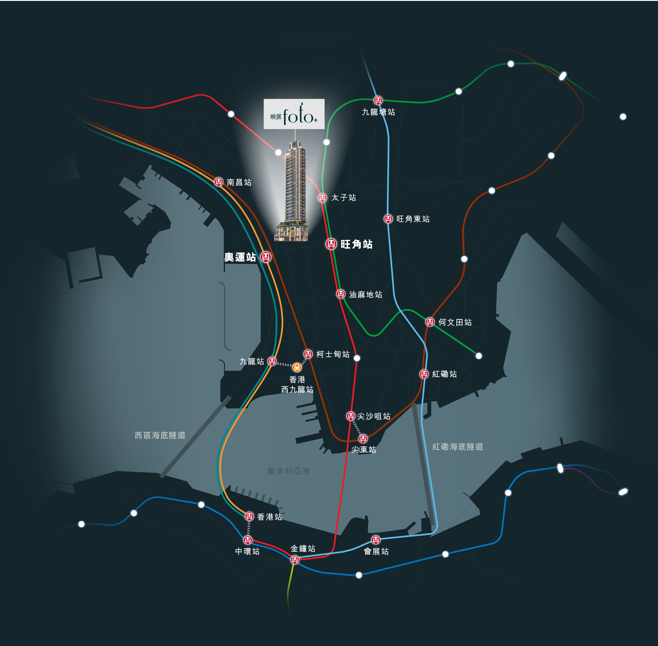 6. 港鐵路線示意圖僅顯示部份港鐵路線及車站,經簡化及電腦修飾處理及不按比例製作,僅供參考,並不代表發展項目與其他地區的實際距離、位置及交通時間。資料來源(擷取日期:2025年12月9日):香港鐵路有限公司網站 - http://www.mtr.com.hk。網站所述的內容可能不時更改,賣方對該等內容不作出任何不論明示或隱含之要約、陳述、承諾或保證。示意圖內之發展項目外觀設計概念圖經電腦修飾處理,僅作顯示發展項目部分大概外觀之用,並非顯示發展項目或其周邊之建築物及環境。發展項目建築物外牆之冷氣機、喉管、導管、格柵、發電機排氣喉及其他機電設施及屋頂上的天線及避雷桿等均無顯示。所顯示之外牆物料及顏色、植物、燈飾、燈光效果及其他物件亦可能因各種因素而與實際有異,亦未必會在日後落成的發展項目或其附近範圍內出現。相關設計概念圖並不反映發展項目實際外觀和景觀,亦非說明發展項目最後落成之面貌。賣方亦保留根據有關政府部門批核的最新建築圖則修改發展項目及其任何部分的權利。相關設計概念圖並不構成亦不得詮釋成作出任何不論明示或隱含之要約、陳述、承諾或保證。詳情請參閱售樓說明書。(註:售樓說明書於本網站之製作日期尚未提供予公眾領取)